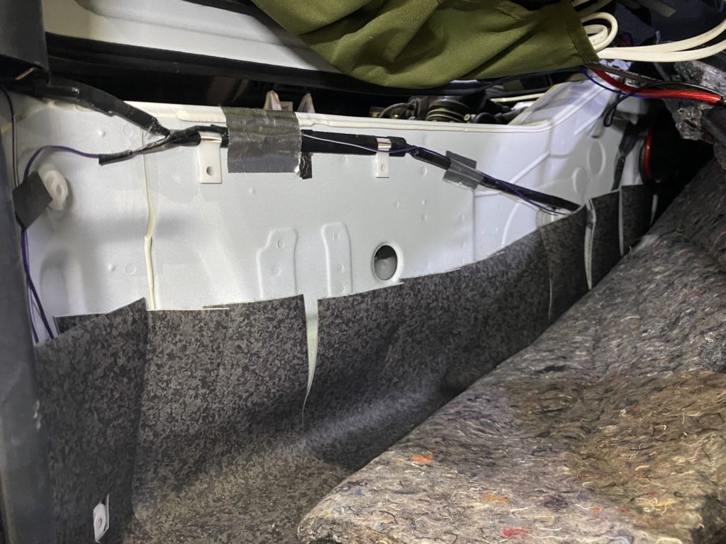 助手席シート下にあるバッテリーから電源を取得するため、配線を通す穴をホールソーにて開けます!