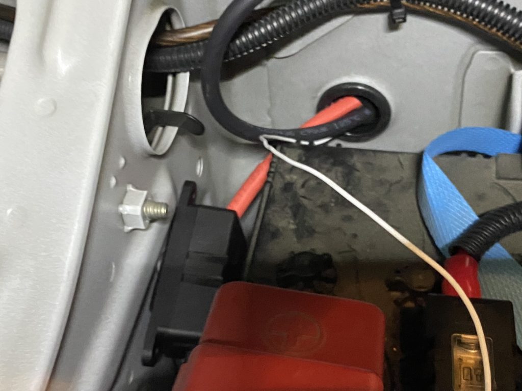 穴あけしたらグロメットをつけて配線をバッテリーまでもっていきます